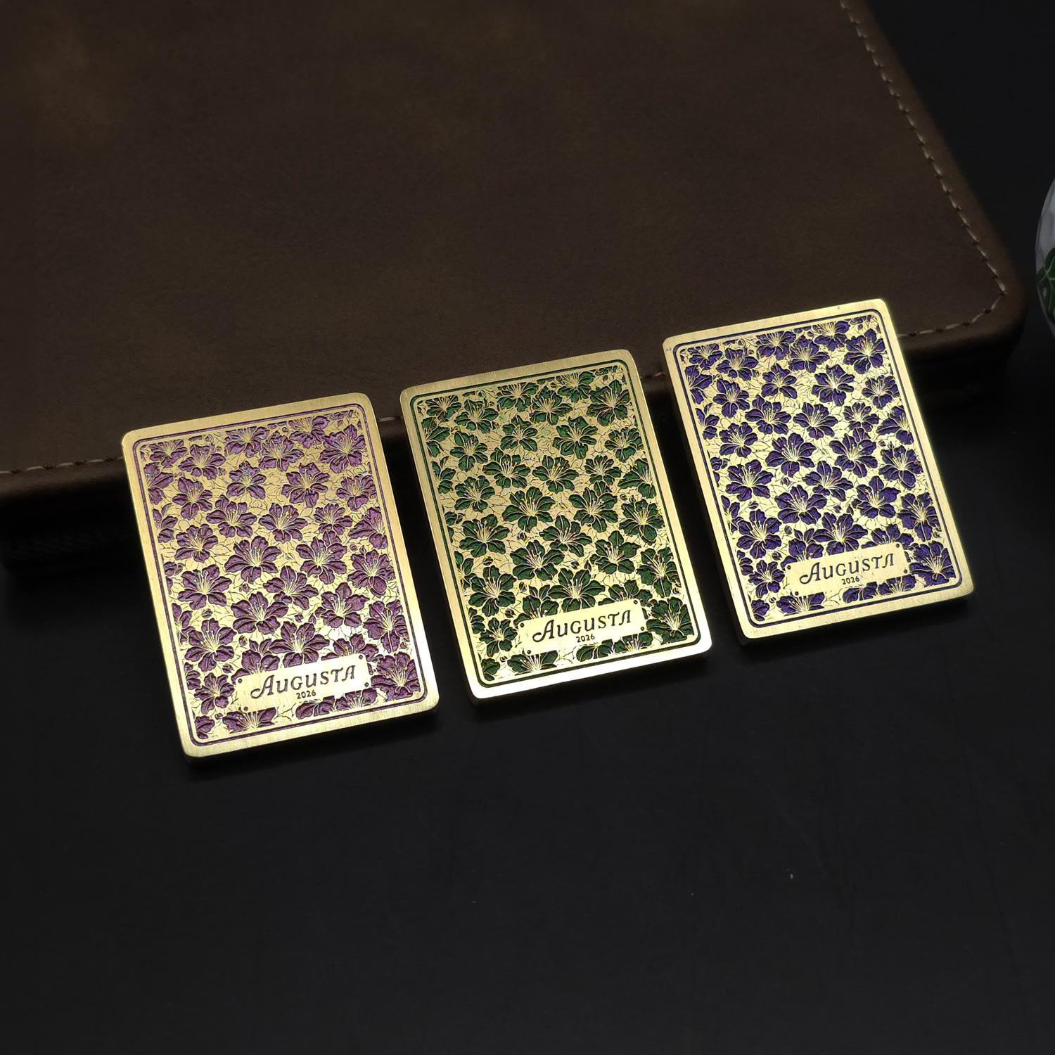 The front features a finely detailed azalea pattern, available in your choice of pink, green, or purple – a nod to the vibrant blooms that define Augusta each spring. Crisp, high-definition printing brings the floral design to life against the brushed metal finish, creating a striking yet refined look on the green.