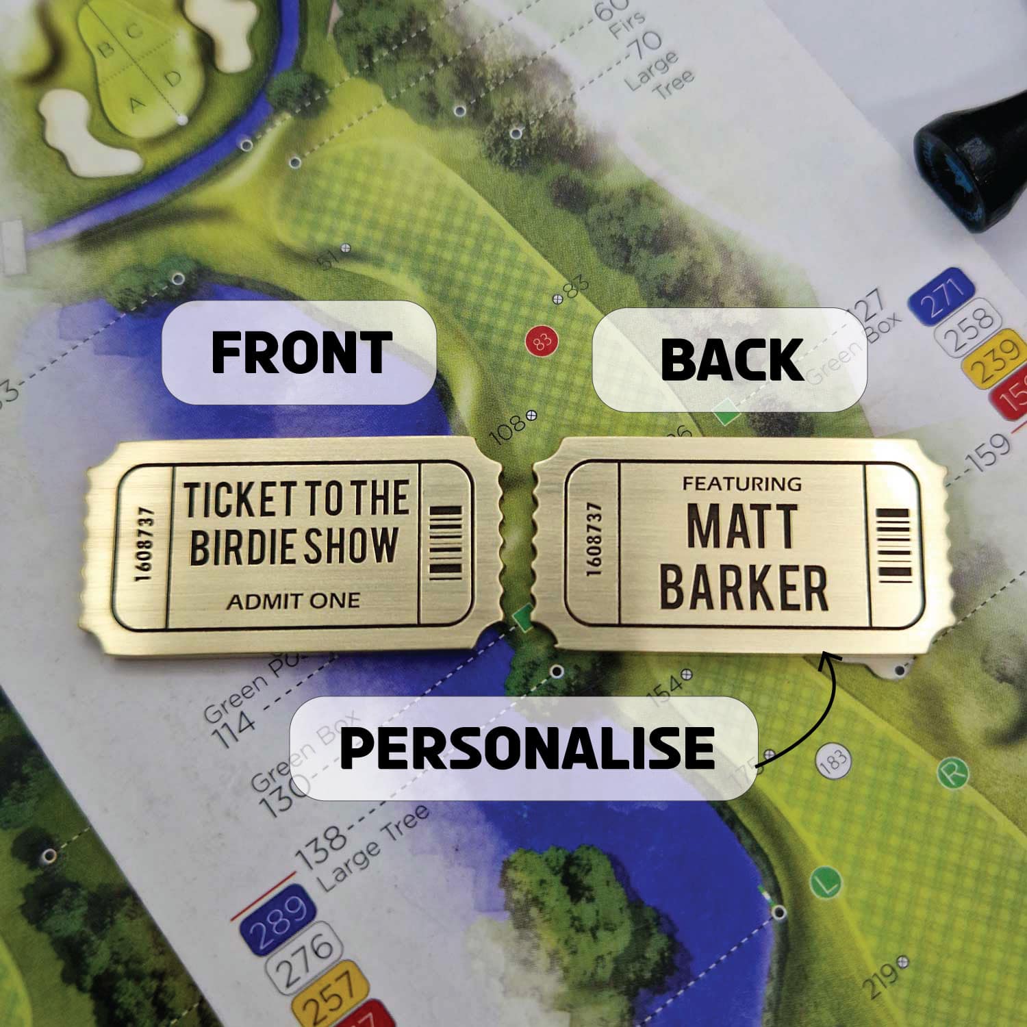 But here’s where it gets even more exciting. Flip it over, and there it is – your name, showcased proudly as the star of the show. Imagine your name following the iconic words ‘Featuring…’ It’s not just a marker; it’s your moment in the spotlight, your ticket to every birdie, eagle, and hole-in-one. Carry it in your pocket, and let it be a reminder: every swing is your performance, every hole is your stage.